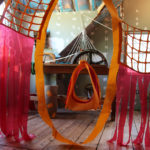 As the viewer enters the space, they are immediately confronted with a large orange oval, which acts as a portal that must be stepped through in order to encounter the bizarre alternate reality within. In this space a patchwork form dangles on cartoonish silver chains, a workbench displays a plethora of ambiguous objects, an abstracted flag pins down a map of an unrecognisable world, and a blue tunnel leads into the bowels of the space where out of the window a concrete ship-like sculpture can be seen sailing into the distance.