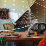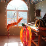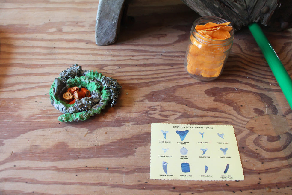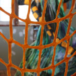 Fabric, wire, wood, rope, orange peel, metal tape, burlap, found objects, blue plastic, postcards